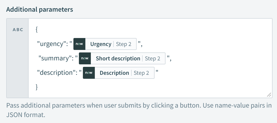 Parameter values to be passed onto the next recipe when button is clicked, for example: Datapills must be enclosed within double quotes, and parameter names should be entirely lowercase. These parameters can be supplied by users. For example, you can supply parameters such as the urgency of an issue in ServiceNow, or specific recipe details like the Message ID from a previous Microsoft Teams message.